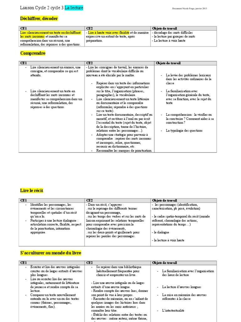 Liaison Cycle 2 Cycle 3 La Lecturedocument Nicole Fraga Mise En